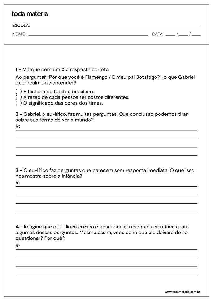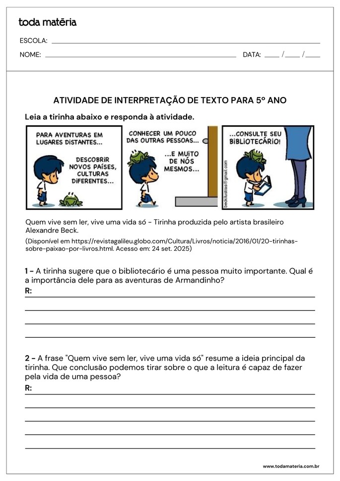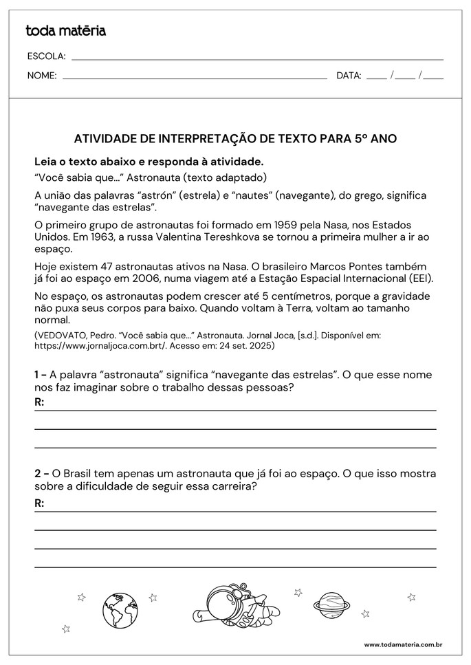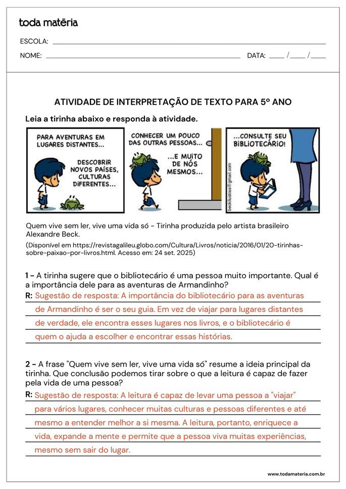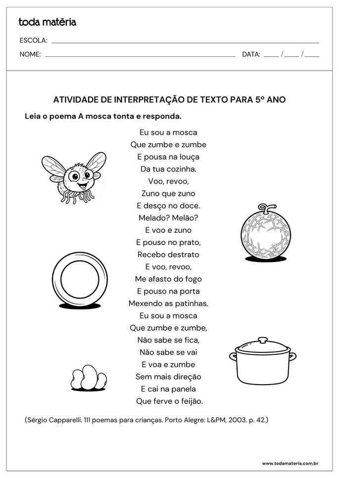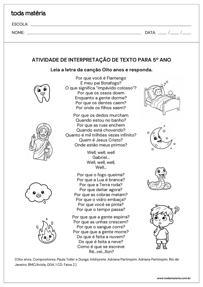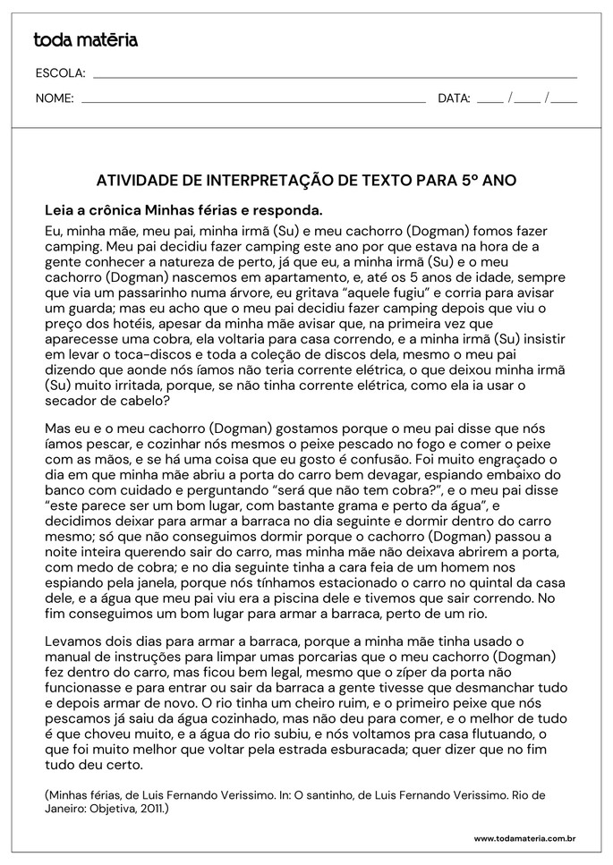 FERNANDES, Márcia. Atividades de interpretação de texto para 5º ano (para imprimir). Toda Matéria, [s.d.]. Disponível em: https://www.todamateria.com.br/atividades-de-interpretacao-de-texto-para-5-ano-para-imprimir/. Acesso em: