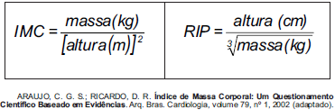 Embora o Índice de Massa Corporal (IMC) seja amplamente utilizado, existem ainda inúmeras restrições teóricas ao uso e às faixas de normalidade preconizadas. O Recíproco do Índice Ponderal (RIP), de acordo com o modelo alométrico, possui uma melhor fundamentação matemática, já que a massa é uma variável de dimensões cúbicas e a altura, uma variável de dimensões lineares. As fórmulas que determinam esses índices são: