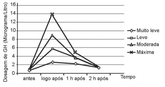 GH é a sigla que denomina o hormônio do crescimento (do inglês growth hormone), indispensável para retardar o processo de envelhecimento. À medida que envelhecemos, a liberação desse hormônio na corrente sanguínea vai diminuindo. Estudos têm demonstrado, porém, que alguns métodos de treinamento aumentam a produção de GH. Em uma pesquisa, dez homens foram submetidos a sessões de 30 minutos de corrida, em uma esteira, em diferentes intensidades: muito leve, leve, moderada e máxima. As dosagens de GH, medidas por coletas de sangue feitas antes e logo após as sessões, e também 1 hora e 2 horas após o término, são fornecidas no gráfico.