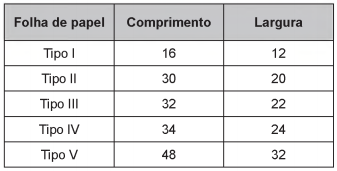 Numa tarefa escolar, um aluno precisava fazer a planta baixa de sua casa em uma escala de 1 : 40. Ele verificou que a base da casa era retangular, tendo 12 metros de comprimento e 8 metros de largura. O aluno foi a uma papelaria e lá observou que havia cinco tipos de folhas de papel, todas com diferentes dimensões. O quadro contém os cinco tipos de folhas, com seus comprimentos e larguras fornecidos em centímetro.