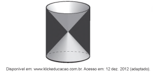 A figura mostra uma anticlepsidra, que é um sólido geométrico obtido ao se retirar dois cones opostos pelos vértices de um cilindro equilátero, cujas bases coincidam com as bases desse cilindro. A anticlepsidra pode ser considerada, também, como o sólido resultante da rotação de uma figura plana em torno de um eixo.