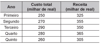 Dois amigos abriram um restaurante. No primeiro ano, o custo total com as despesas do restaurante chegou a 250 mil reais. A receita neste ano foi de 325 mil reais, obtendo assim um lucro de 75 mil reais (diferença entre a receita e o custo total). A tabela representa o custo total e a receita nos cinco primeiros anos.
