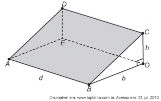 A inclinação de um telhado depende do tipo e da marca das telhas escolhidas. A figura é o esboço do telhado da casa de um específico proprietário. As telhas serão apoiadas sobre a superfície quadrada plana ABCD, sendo BOC um triângulo retângulo em O. Sabe-se que h é a altura do telhado em relação ao forro da casa (a figura plana ABOE), b = 10 é o comprimento do segmento OB, e d é a largura do telhado (segmento AB), todas as medidas dadas em metro.