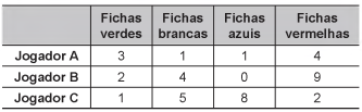 Em um jogo de tabuleiro, a pontuação é marcada com fichas coloridas. Cada ficha vermelha vale um ponto. Três fichas vermelhas podem ser trocadas por uma azul, três fichas azuis podem ser trocadas por uma branca, e três fichas brancas podem ser trocadas por uma verde. Ao final do jogo, os jogadores A, B e C terminaram, cada um, com as quantidades de fichas, conforme a tabela seguinte: