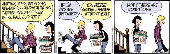 A partir da interpretação da tirinha abaixo, assinale a alternativa que resume, por meio de uma estrutura com zero conditional, a percepção de Jeremy sobre o pedido feito para ele.