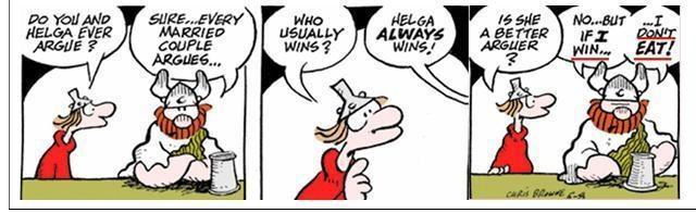 No último quadrinho, Hagar apresenta uma condição que faz com que Helga ganhe todas as discussões entre eles. Assinale a alternativa que explica essa condição corretamente:
